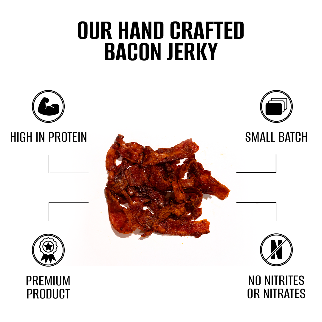 Experience a flavor adventure with our Uncured Bacon Jerky: Maple and Brown Sugar. This gourmet jerky combines thick-cut, uncured bacon with a delectable blend of rich maple and sweet brown sugar, delivering a perfect balance of savory bacon goodness and a touch of sweetness.