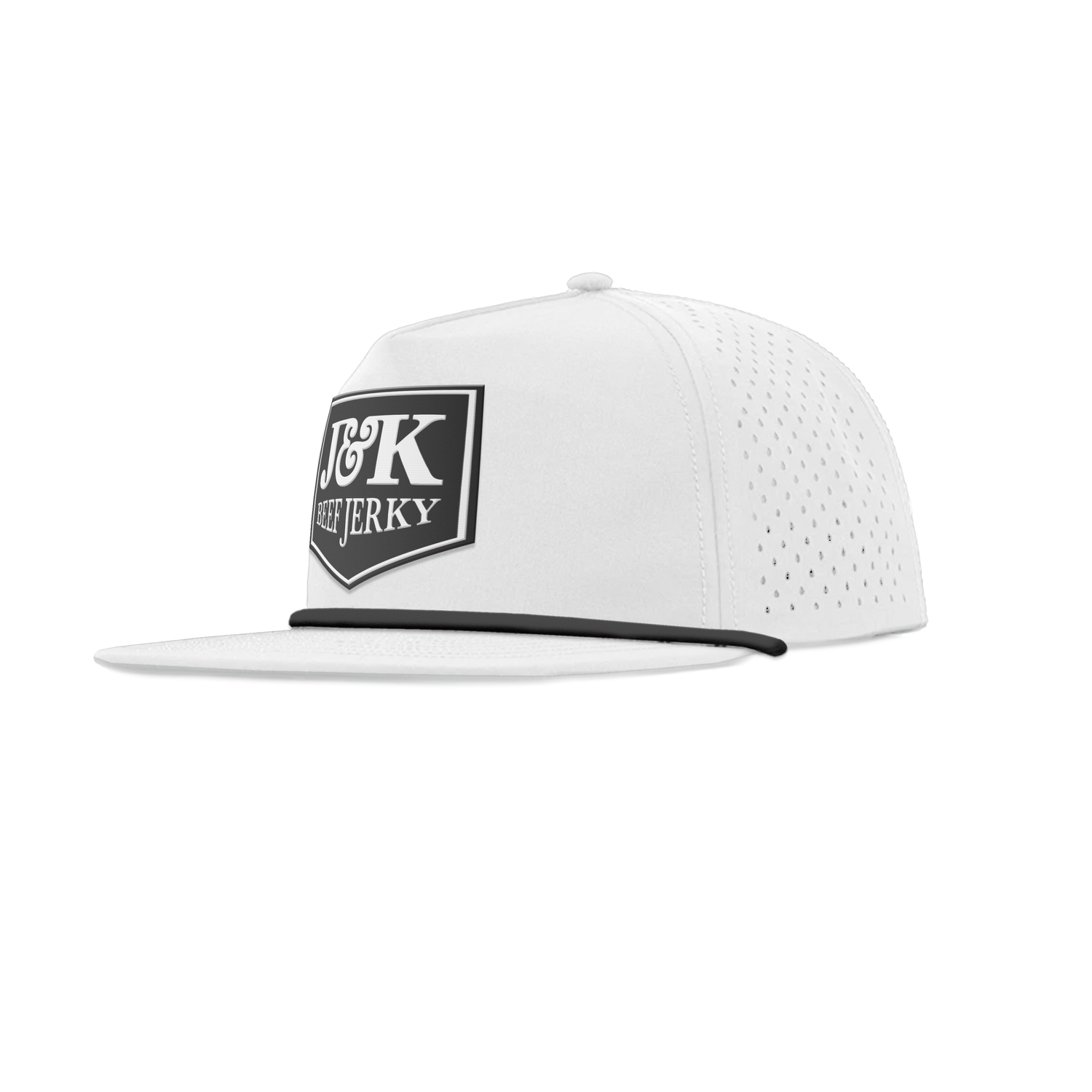Introducing the J&K Beef Jerky Flat Brim Hat, designed for those who want to represent their favorite jerky brand in style. This sleek black cap features a bold J&K Beef Jerky logo on the front, giving it a rugged yet modern look. The perforated sides add breathability, making it ideal for all-day wear, whether you're out on the trail or just hanging out. With a classic flat brim and a stylish white rope detail across the front, this hat is perfect for casual wear or your next outdoor adventure. Show off your love for quality jerky and keep cool with this stylish, high-performance hat!