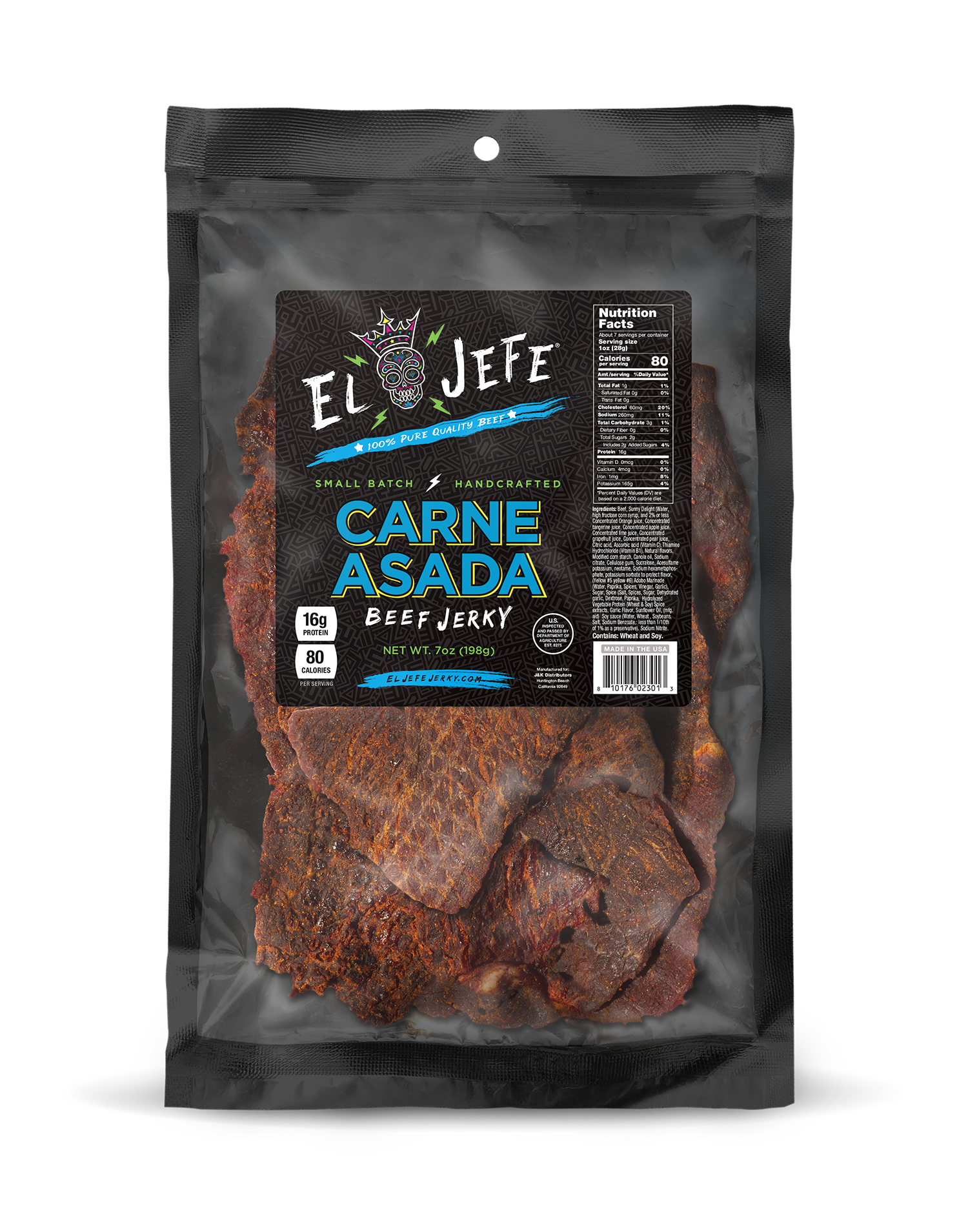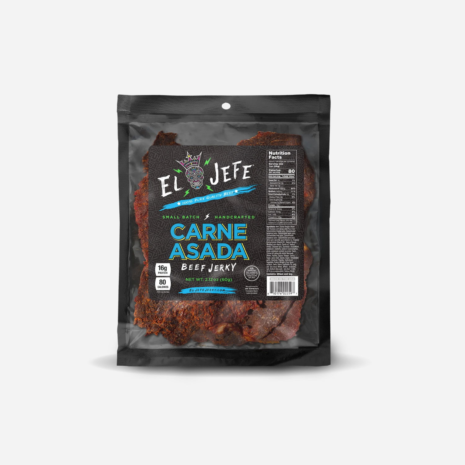 Infused with our signature blend of six juices and a medley of aromatic spices including garlic, paprika, and salt, each tender strip of beef jerky bursts with smoky, delicious flavor. Whether you're on the go, enjoying outdoor adventures, or simply craving a satisfying snack, our Carne Asada Beef Jerky promises to delight your taste buds with every bite.