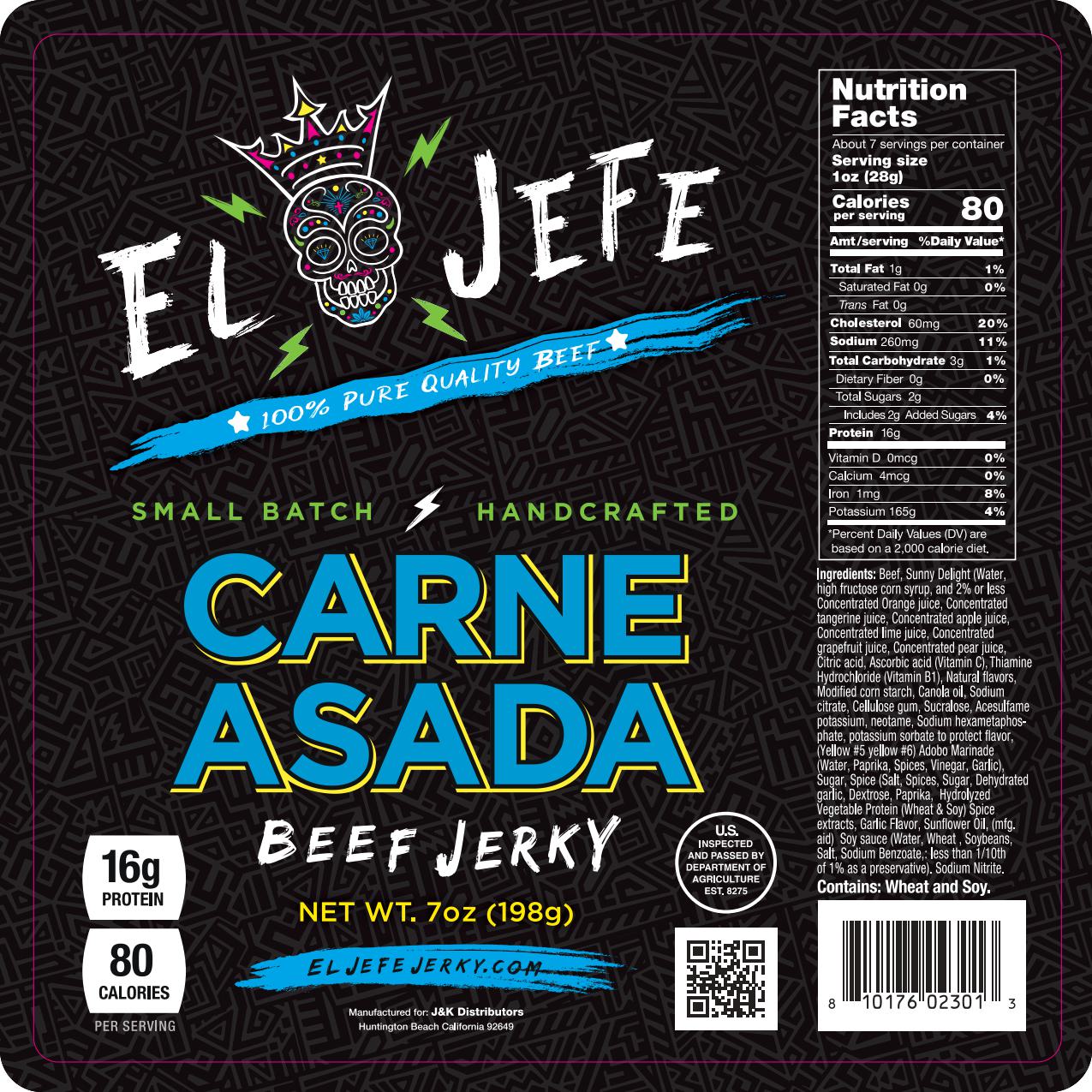 Infused with our signature blend of six juices and a medley of aromatic spices including garlic, paprika, and salt, each tender strip of beef jerky bursts with smoky, delicious flavor. Whether you're on the go, enjoying outdoor adventures, or simply craving a satisfying snack, our Carne Asada Beef Jerky promises to delight your taste buds with every bite.